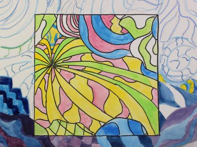 色と形の基礎演習です。図案のパターンの中でも最もシンプルなシマ模様をテーマにしました。これを変化させたり、絵や形と組み合わせたり、アレンジを加えて描きます。枠も用意して自由に使ってもらいました。鉛筆で下書きをしたあと、ク・・・