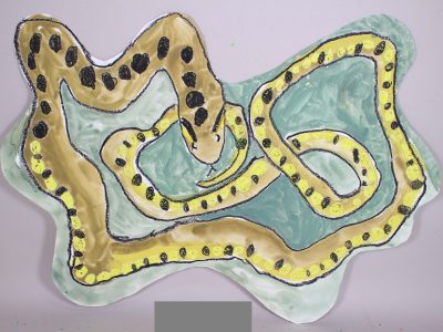 ぐにゃぐにゃした有機的な形の紙に描いてみよう、という課題です。発想を刺激するひとつの手法として取り組みました。紙の形からイメージして、何でも好きなものを、のびのび描いてもらいました。 紙の形を何かに見立てたり、夢の形みた・・・