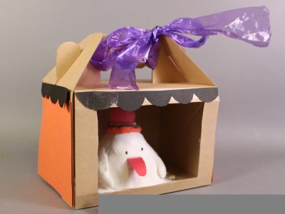 図工ランド定番課題のひとつ、5年ぶりの登場です。三角屋根のAフレームハウスです。名前はアルファベットのAの字からきています。実際にある建築スタイルで、雪に強く、作るのが簡単で、森の風景などになじむ形です。この形を使って、・・・