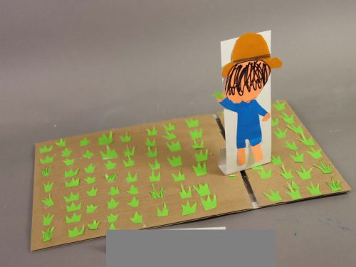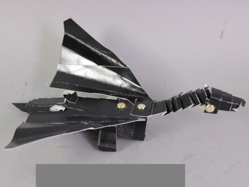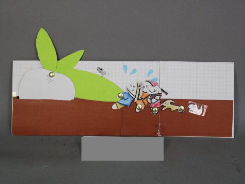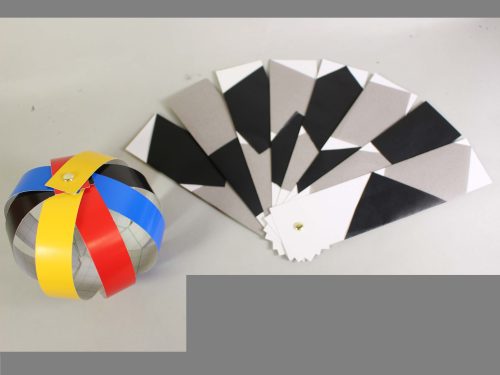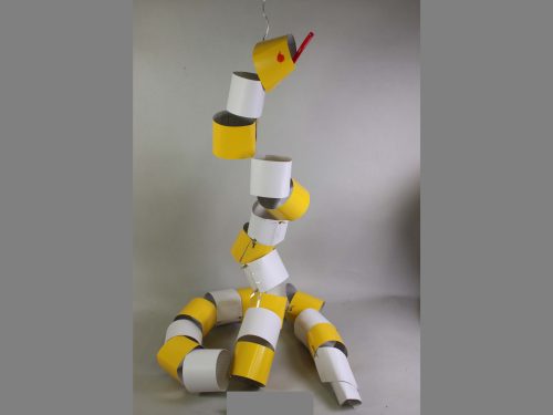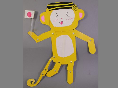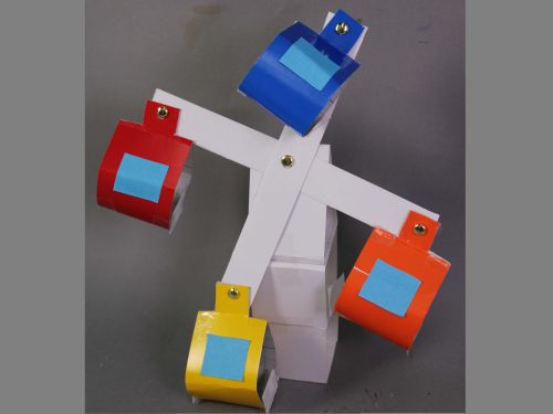 立体の造形遊びです。「割りピン」のしくみを使った工作をしてもらいました。割ピンと言われても一般的にはなじみが少ないと思いますが、図工ランドでは脇役として時々登場する材料です。今回はそれにスポットを当てて主役としました。機能としては点で固定して角度を変えたり、溝をスライドさせたりする留め方ができます。金色に光る飾りとして使ってもOKです。