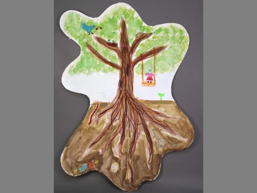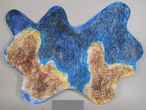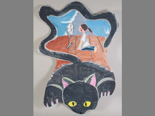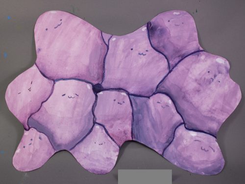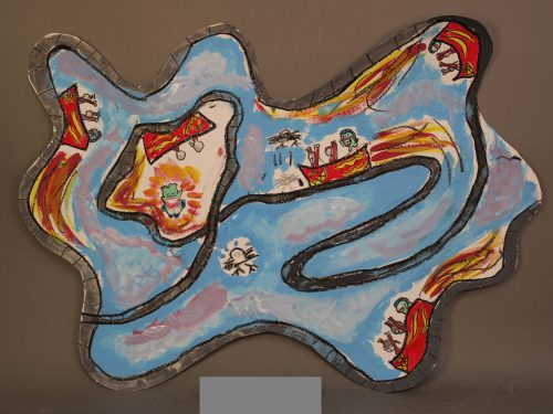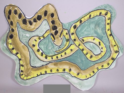 ぐにゃぐにゃした有機的な形の紙に描いてみよう、という課題です。発想を刺激するひとつの手法として取り組みました。紙の形からイメージして、何でも好きなものを、のびのび描いてもらいました。