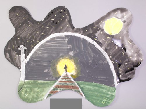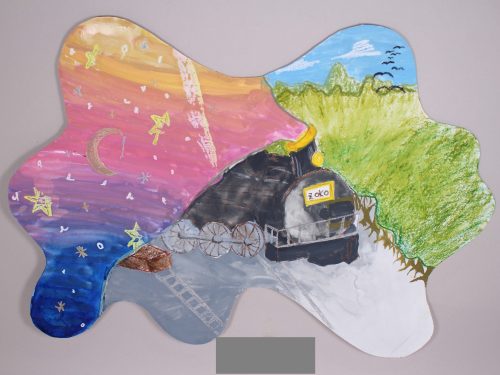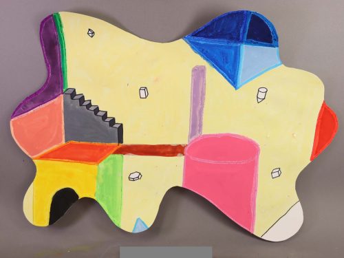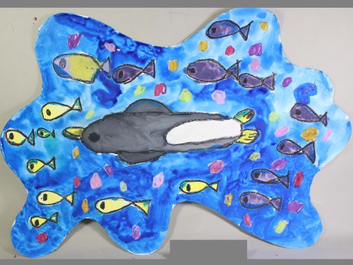 紙の形を何かに見立てたり、夢の形みたい・・と不思議な想像の世界を描いた生徒さんもいます。飛び出した部分をうまく使ったり、全体を何かに見立てたりと、様々に形を活用する姿が見られました。生徒さんそれぞれ、この形をどう使おうかな、と考えてくれました。「何描いていいか、わかんな~い」という生徒さんはほとんどいませんでした。「画面は四角」という枠を取り外すことにより、自由に発想することができました。これをヒントに、さらに自分で違う形の画面や発想に発展することを期待します・・(ランド長 木村明彦)