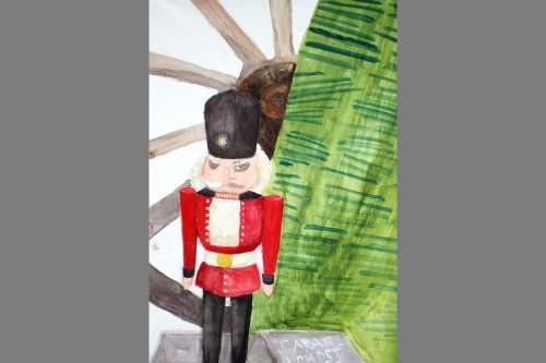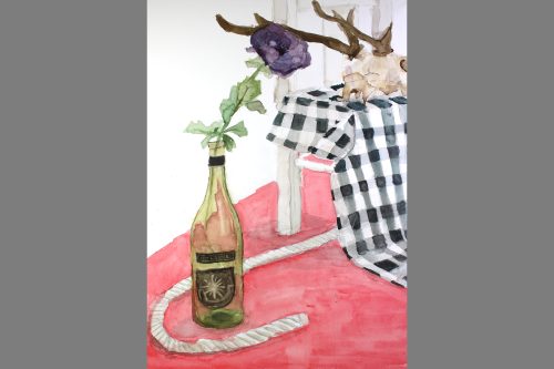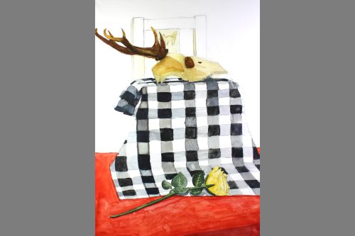 静物水彩では、講師陣がモチーフの配置を考えますが、それをすべて画面内に納めるように描く必要はありません。特に展覧会用の課題ということもあり講師陣も力が入っているため、モチーフのボリュームは満点です。どの部分を切り取って描くかがポイントになります。
