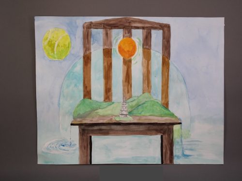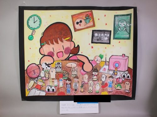 思春期の生徒さんは、自分の内面を表現することは嫌がる傾向があります。そこを折り合いをつけて、描いてくれた作品です。様々な表現があって見る方も楽しませてもらいました。(木村明彦)