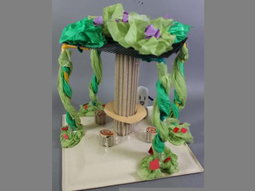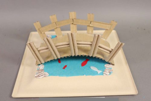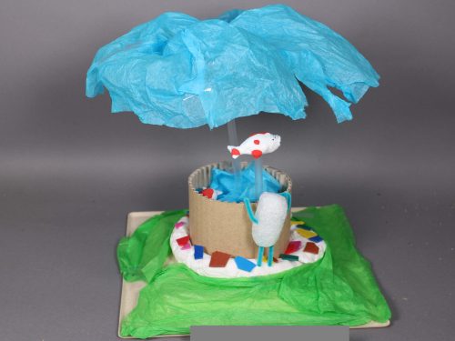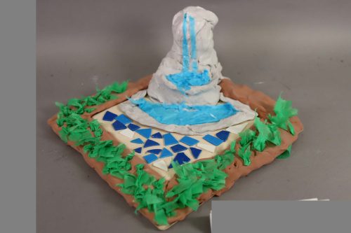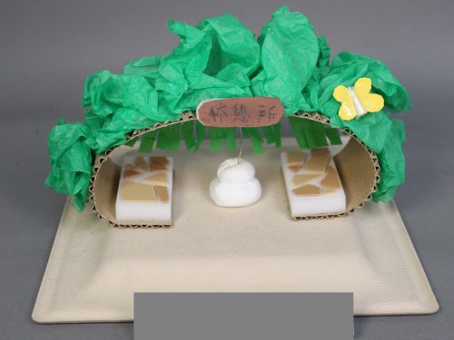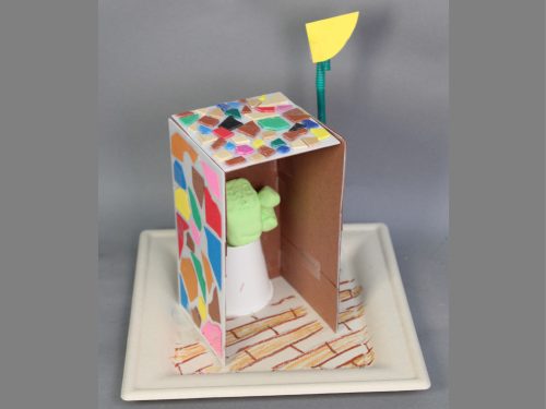 ベンチやパーゴラ、彫刻、噴水などのある魅力的な小さな空間がいろいろできました。一方で遊び場や乗り物、売店や迷路など、アクティブなテーマをもったものもありました。これは良い待ち合わせ場所になりそうだね、という小さなランドマークも登場しました。粘土とモザイクタイルの組み合わせが、いろどりを添えています。小さな工作でしたが、そのおかげで部屋のちょっとしたオブジェにもなりそうでした。(ランド長 木村明彦)