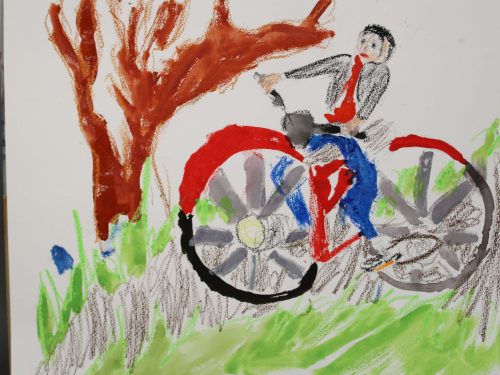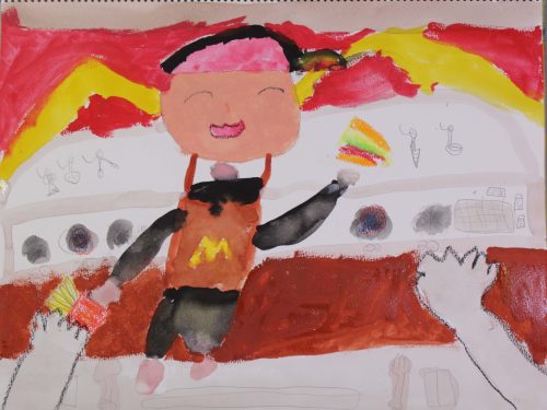 のびのびと身体を動かす人、ステージで自分を表現する人、日常生活の1コマを切り取った絵、ストーリー性のある場面を想像して描いてくれた子もありました。いろいろな絵が生まれましたので、こどもたちはお互いに良い刺激にもなったかなあと思います。人を描くことをみんな苦手としています、このような課題を時々実施することにより、意外とカンタンと思ってもらって、苦手意識を解消してもらいたいと考えています・・(ランド長 木村明彦)