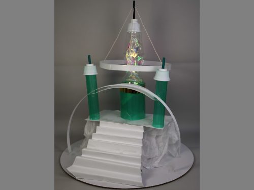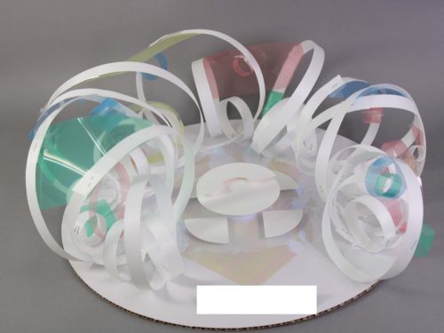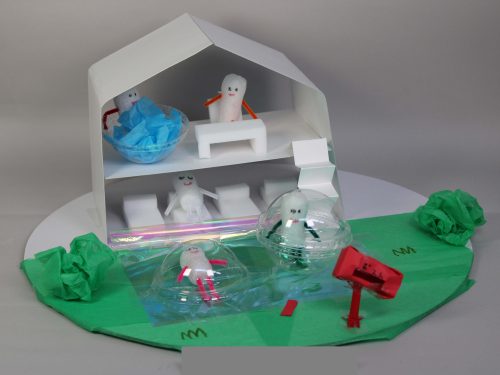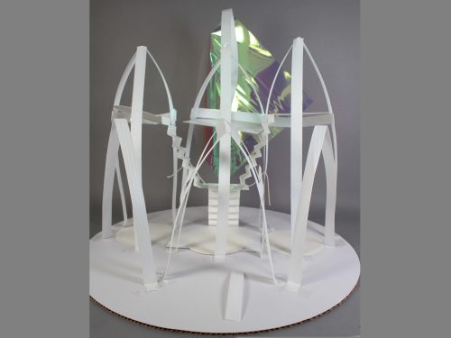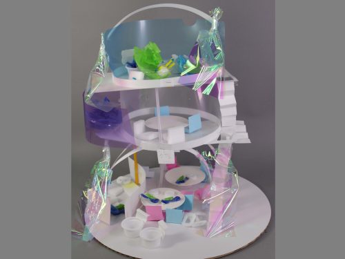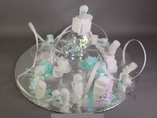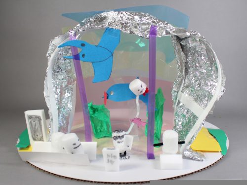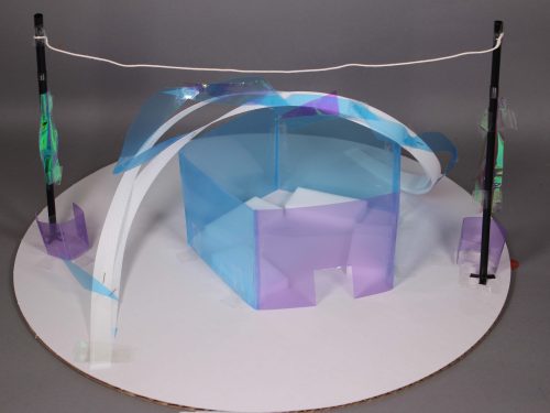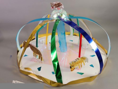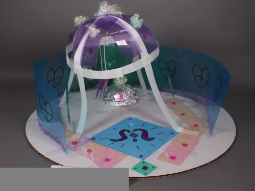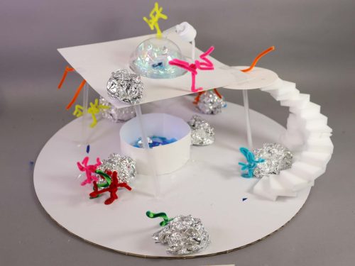 「空間」のデザインの課題です。PPバンドという梱包材料を主な構造材として、丸いダンボールの上に曲線を生かした構造を作ってもらいました。光る素材や透明な材料も用意して、軽やかで有機的、未来的な建物のデザインをめざしています。キラキラした素材は、未来的なイメージや年末年始の気分、季節の雪や氷の表現にも使えそうです。